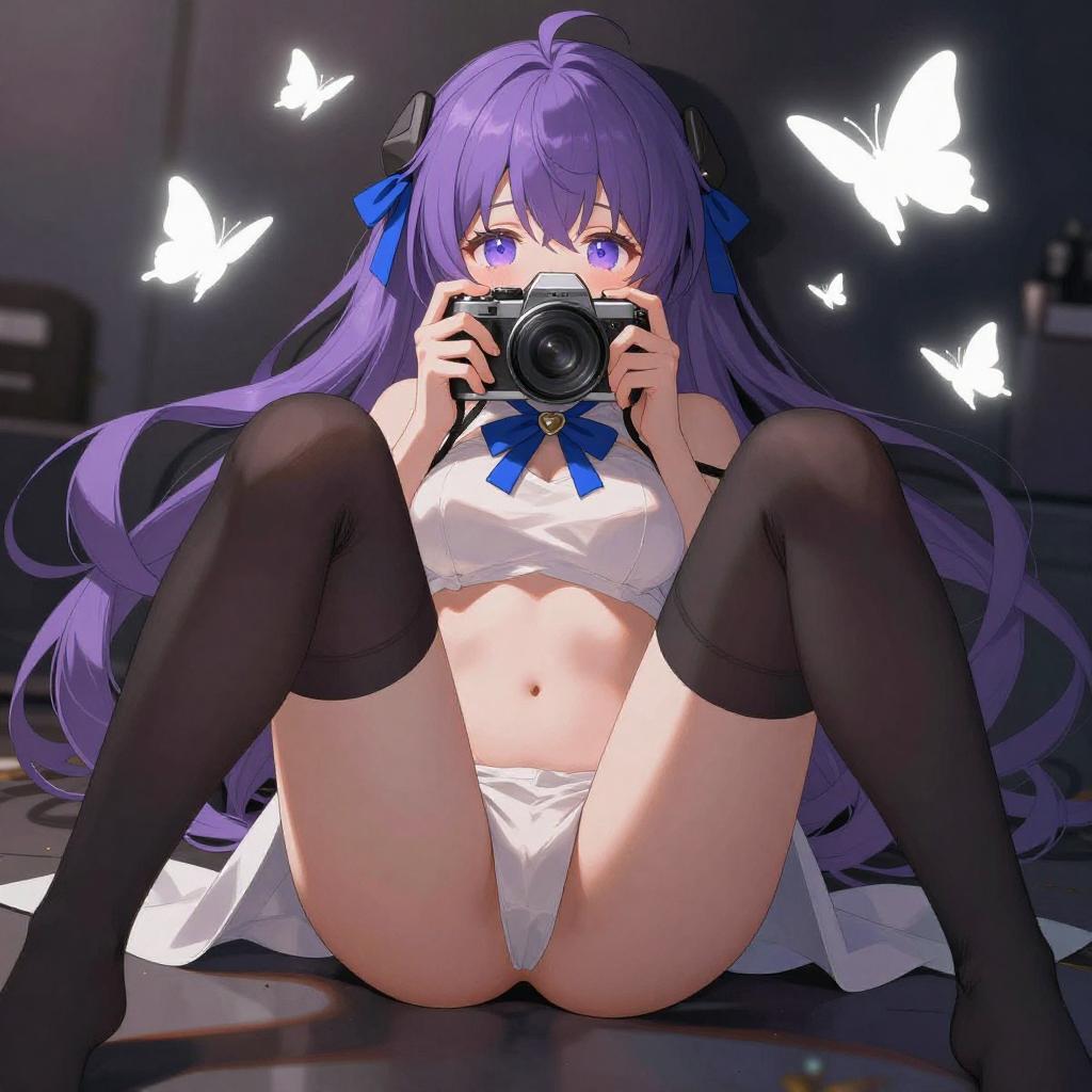Digital anime-style image of a purple-haired girl with blue ribbons, wearing black thigh-high socks, lying on her back with legs spread, exposing her bare genitals. She holds a camera in front of her face, surrounded by glowing white butterflies and a dark, blurred background.