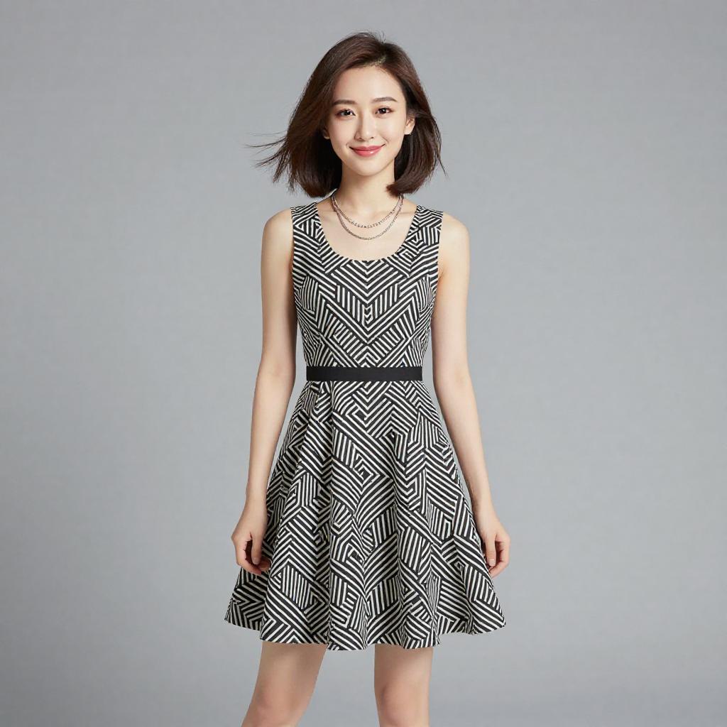 Woman with pretty face and pretty hair. smiling Woman, casual chic, sleeveless A-line dress in black and white with a symmetrical geometric print, scoop neckline, knee-length, flared skirt, layered silver necklace, grey studio background. --sref 1467