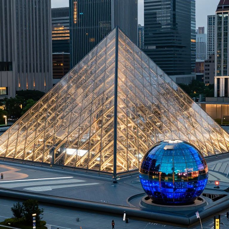 Modern Glass Pyramid and Blue Sphere in Urban Cityscape