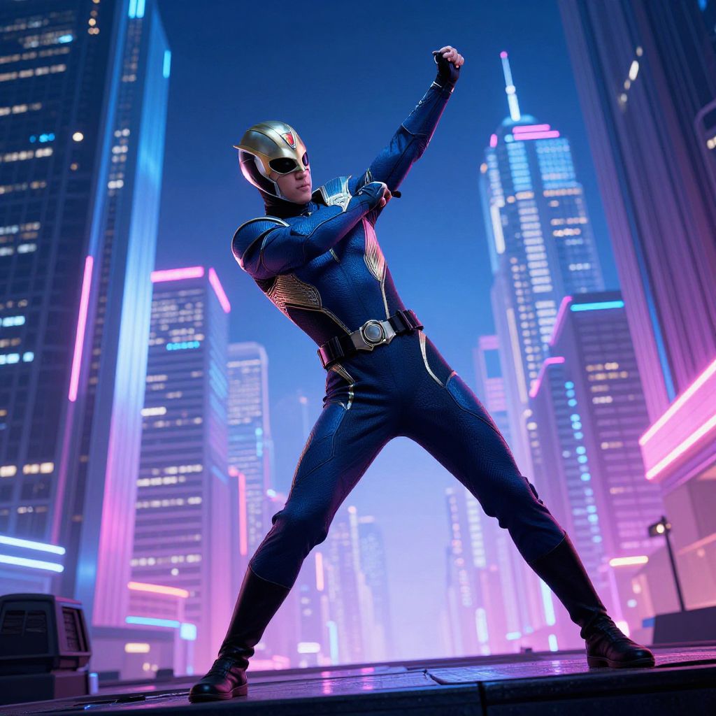 CGI image of a superhero in a blue suit and golden helmet, striking a confident pose in a neon-lit, futuristic cityscape with towering skys