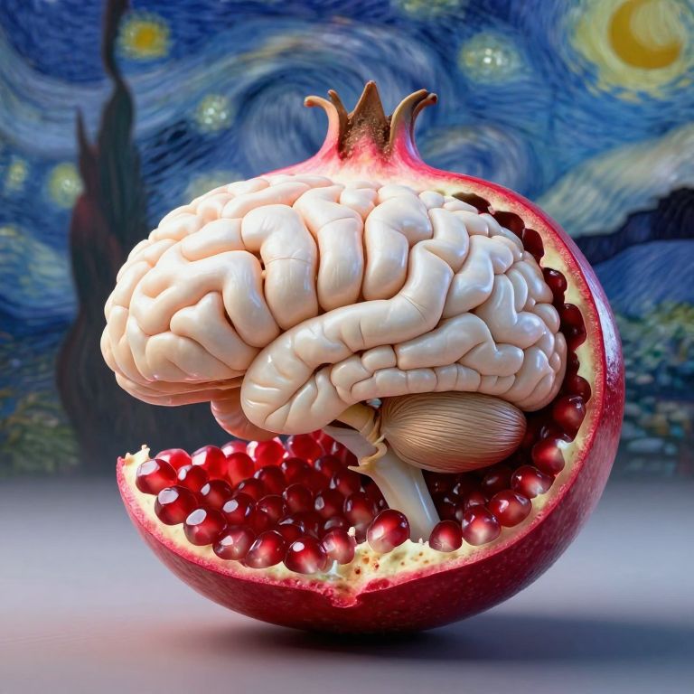 A surreal digital artwork depicting an intricate brain hovering in mid-air within a pomegranate shell, this composition masterfully blends elements of hyper-realism and surrealism. The vivid colors and textures of the fruit juxtaposed against the eerie white matter of the brain create a captivating visual gradient that sparks curiosity and awe. Illuminated by celestial beams reminiscent of Van Gogh's Starry Night, this thought-provoking scene invites viewers to explore the enigmatic depths of consciousness through an imaginative fusion of styles.