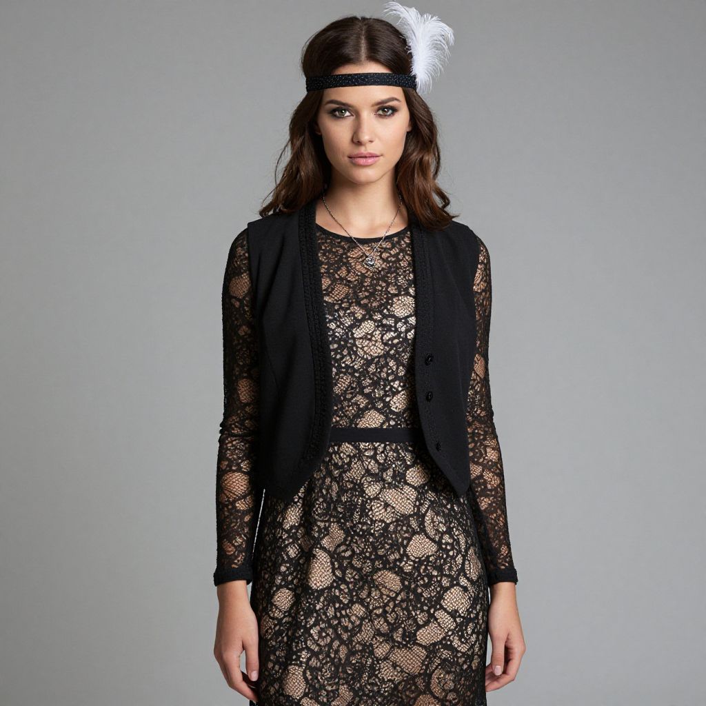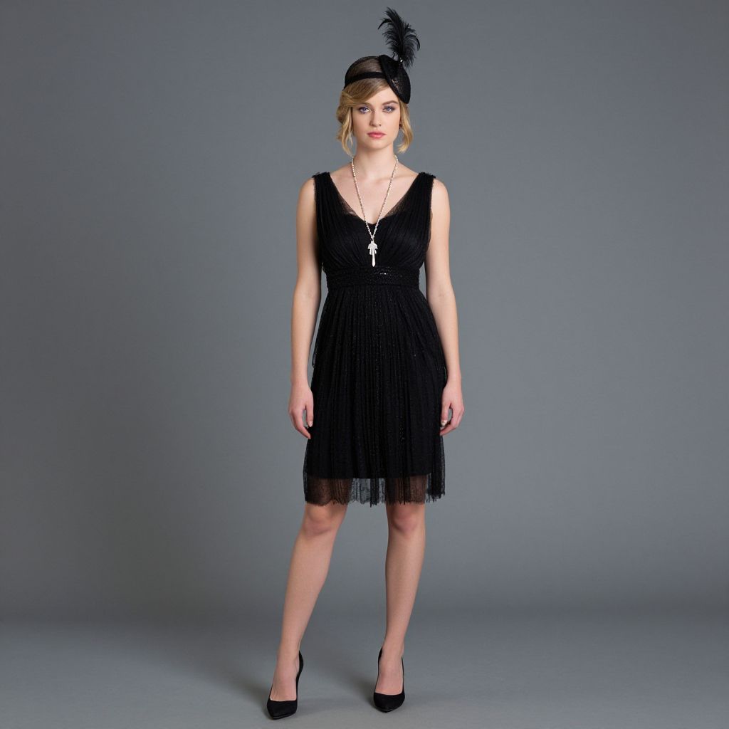 Photograph of a fair-skinned woman with light brown hair in an updo, wearing a sleeveless, black, mid-calf-length dress with a V-neck and fringe detail. She accessorizes with a black feathered hat, black high heels, and a long necklace with a cross pendant. She stands against a plain, gray background, looking directly at the camera with a neutral expression. Her makeup is subtle, emphasizing her natural features. The lighting is even, highlighting the texture of her dress and the simplicity of the background.