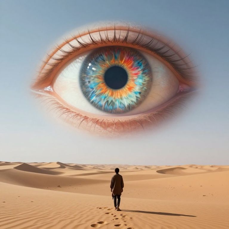 Photograph-like CGI image: A solitary figure in a dark outfit walks through a vast, sandy desert under a clear blue sky. The person is small in comparison to a gigantic, hyper-realistic eye that dominates the upper half of the image. The eye has a vivid blue iris with intricate, colorful radial patterns, surrounded by thick, detailed lashes. The desert features gentle, undulating sand dunes with soft shadows. The eye's intense gaze and the figure's tiny stature create a surreal, almost fantastical atmosphere, blending realism with imaginative elements.