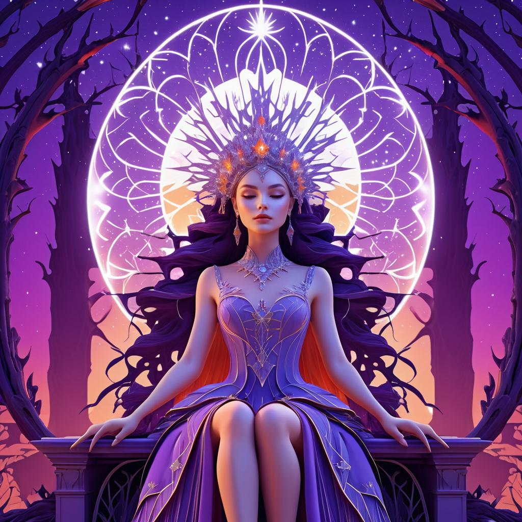 A digital fantasy illustration of a regal queen seated on a dark ornate throne, wearing an elaborate purple gown with gold details. She has long flowing purple hair and a glowing headdress resembling white feathers. The background features mystical purple trees, pillars, and an orange glowing circular symbol, creating an enchanted forest atmosphere.