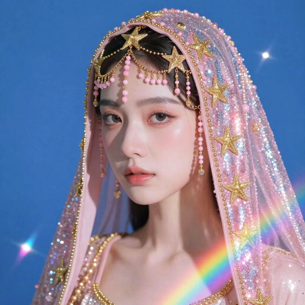 Photograph of a woman with a fair complexion wearing an elaborate, glittery pink hood adorned with gold star-shaped accents and pink beads. Her face is partially obscured by the hood, which also features a gold headpiece with more beads. The background is a vivid blue, and there are rainbow light flares in the foreground. The image has a slightly surreal, digital art vibe.