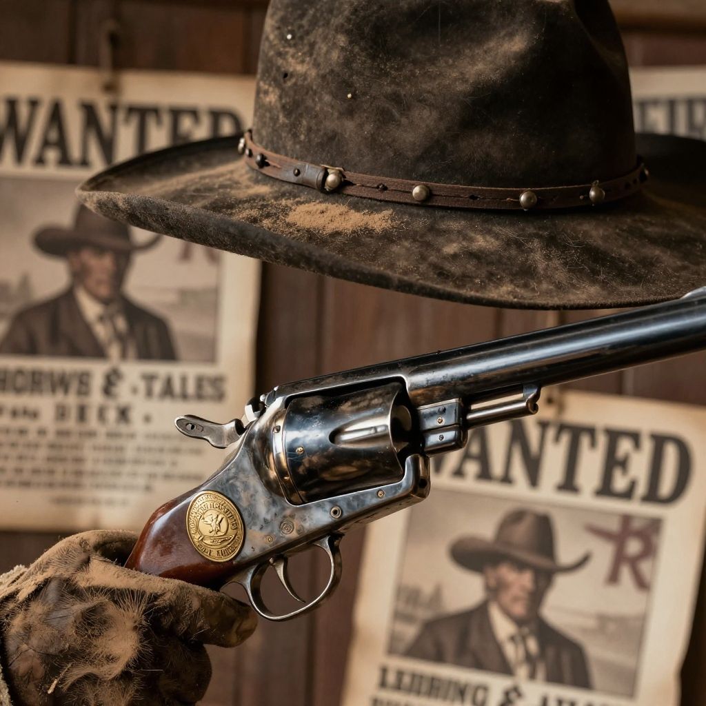 Close-up photo of a Historical Wild West GunslingerStetson hat, revolver holstered, dusty saloon, frontier town, dueling pistols, Old West showdown, wanted poster, rugged outlaw, lawman's badge, dusty trails, six-shooter showdown, frontier justice, quickdraw expertise, Wild West legend, gunfight at high noon, cowboy code.cinematic, sharp focus, intricate, cinematic, dramatic light