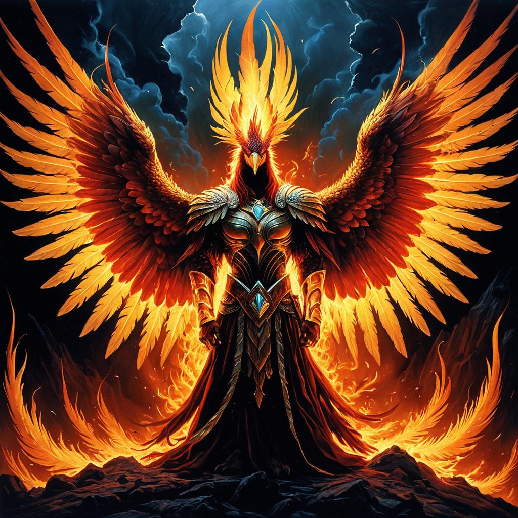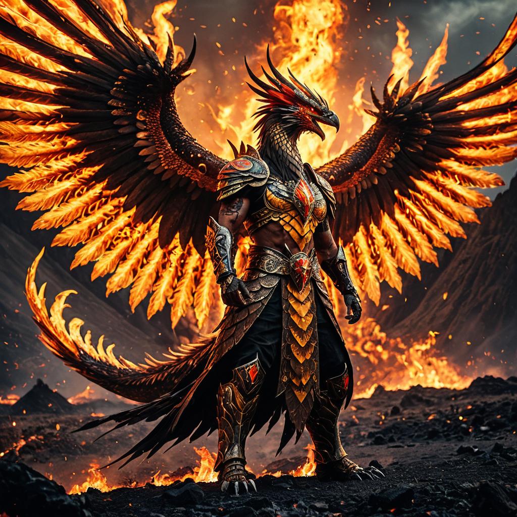 Fire elemental spirit with fiery, glowing feathers in a mythological, epic fantasy style. Created by Carlos Huante, Ruan Jia, with a coherent, hyper-realistic finish.