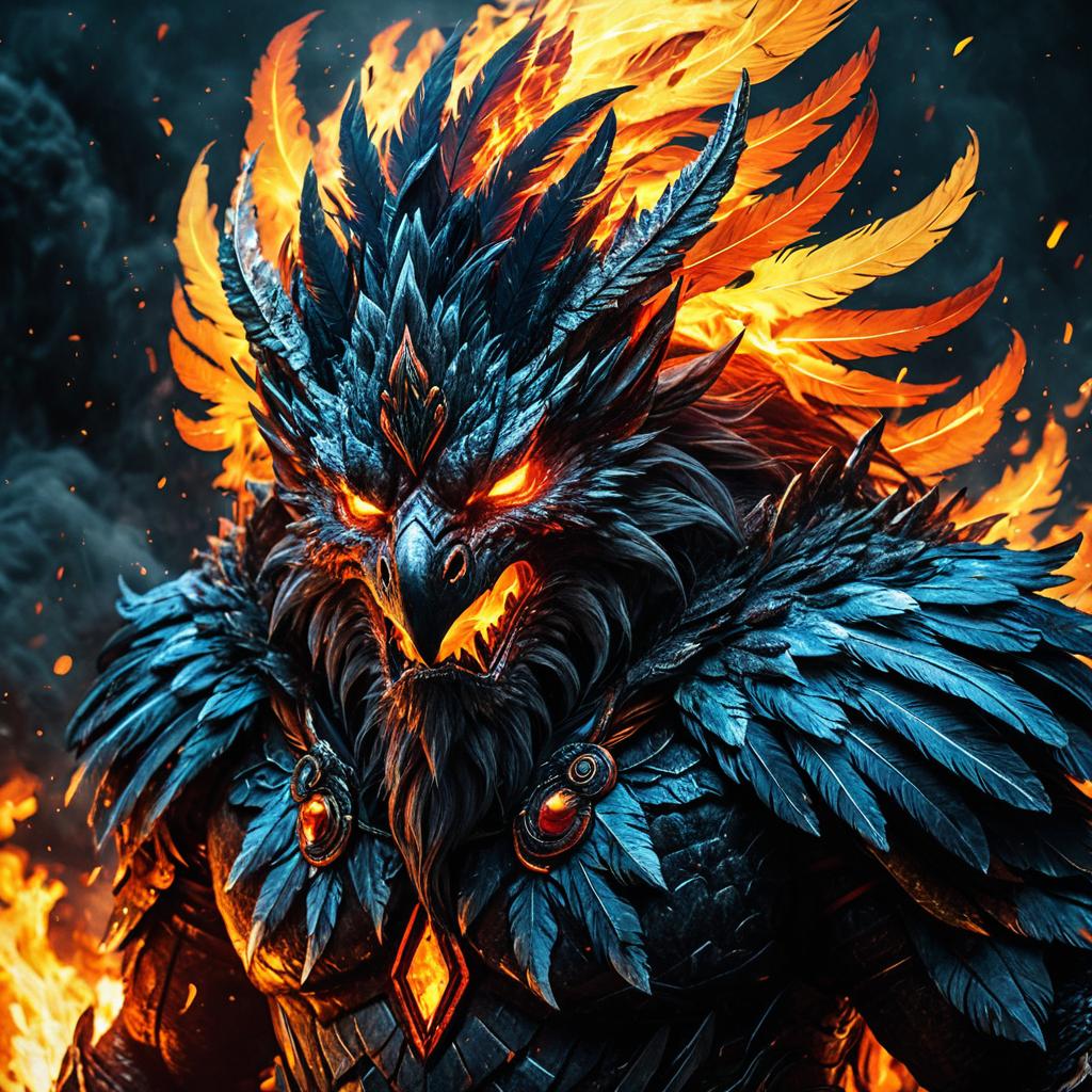 A hyper-realistic depiction of a fire elemental spirit characterized by fiery, glowing feathers in vibrant orange and blue hues. The creature has an intense, mythological fantasy style with glowing eyes, sharp beak, and intricate feathered armor. Embers and flames surround the figure, emphasizing its elemental nature and epic fantasy theme.