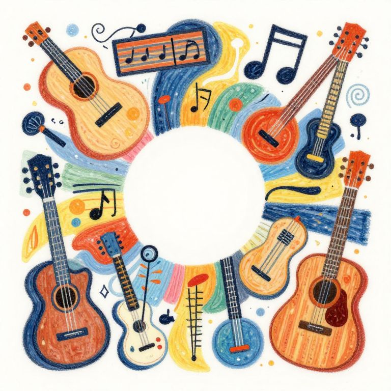 A colorful pastel drawing featuring an abstract collage of various string instruments such as guitars and ukuleles arranged around a central white circle. The background includes musical notes and decorative swirls in multiple colors, creating a vibrant artistic composition.