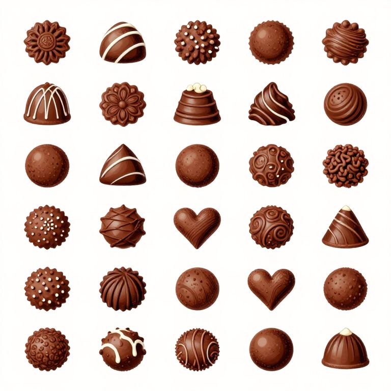 The image presents a collection of hand-drawn icons representing various types of chocolate truffles, arranged in a grid format. Each icon is uniquely designed, showcasing different shapes, textures, and patterns, all rendered in a rich, warm brown color palette. The truffles vary in form, from intricate floral designs to simple, smooth rounds, and even heart-shaped truffles. The icons are meticulously detailed, with some featuring white chocolate drizzles, while others are adorned with sprinkles or intricate patterns. The arrangement is symmetrical, with rows and columns of truffles, each labeled with a unique name in a stylized font. The overall composition is balanced, with the truffles evenly spaced and the labels clearly visible, creating a visually appealing and organized display.