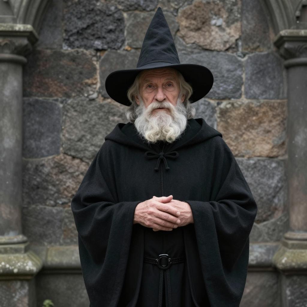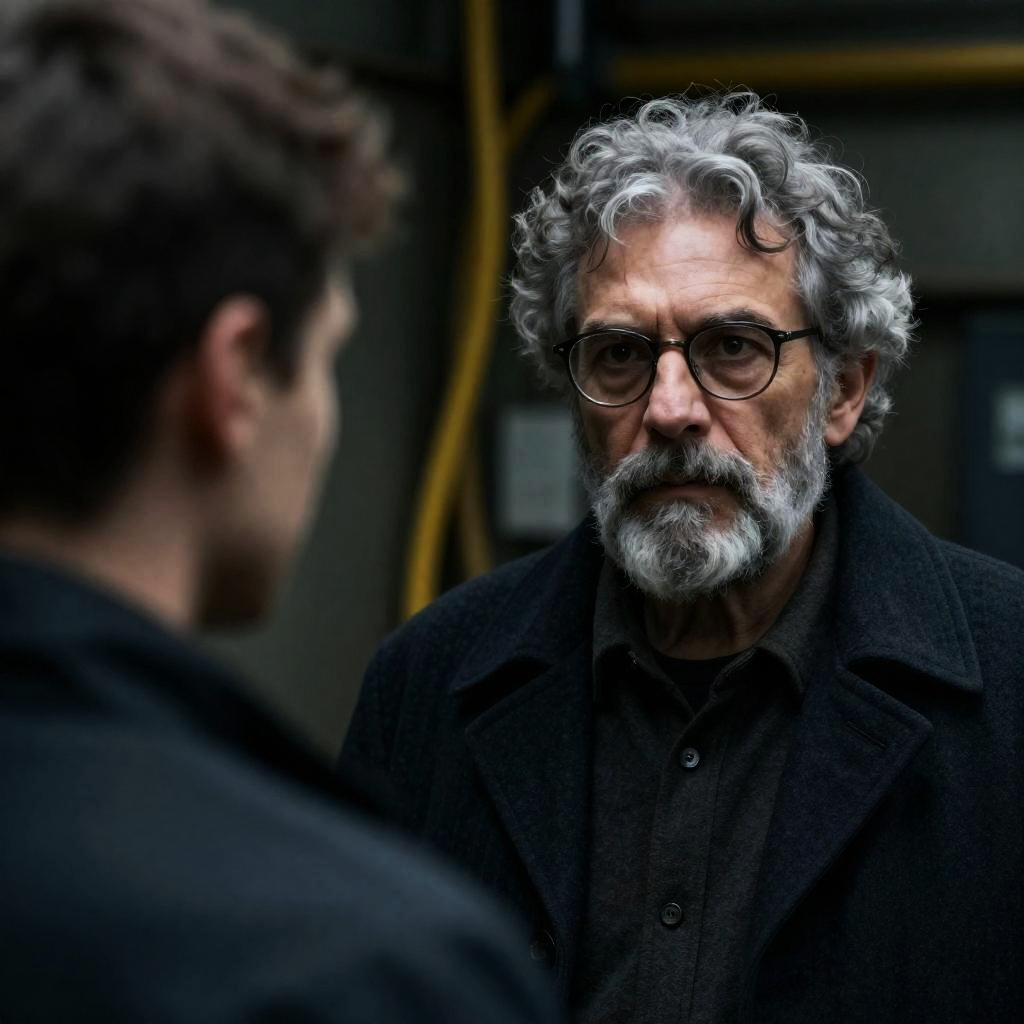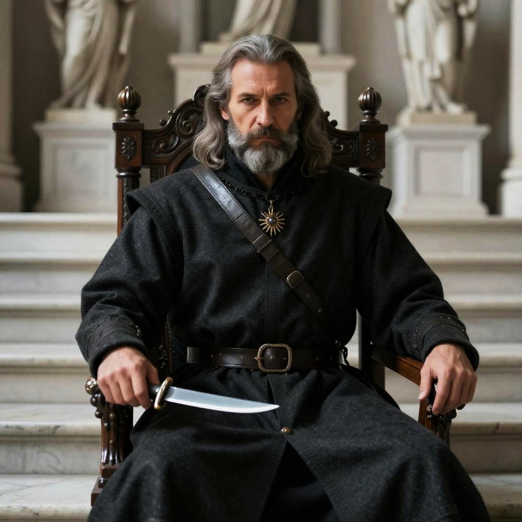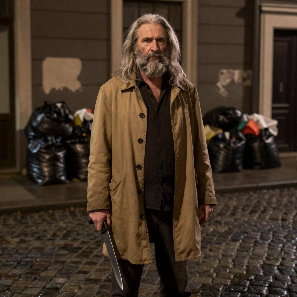 A grizzled man with long, wild gray hair and beard stands on a cobblestone street at night. He wears a loose, tan, buttoned coat over a dark shirt and pants. He holds a large knife in his right hand. The background includes a worn, dark building with piles of black bags and miscellaneous items. The street is wet and reflects light. His intense gaze is directed forward.