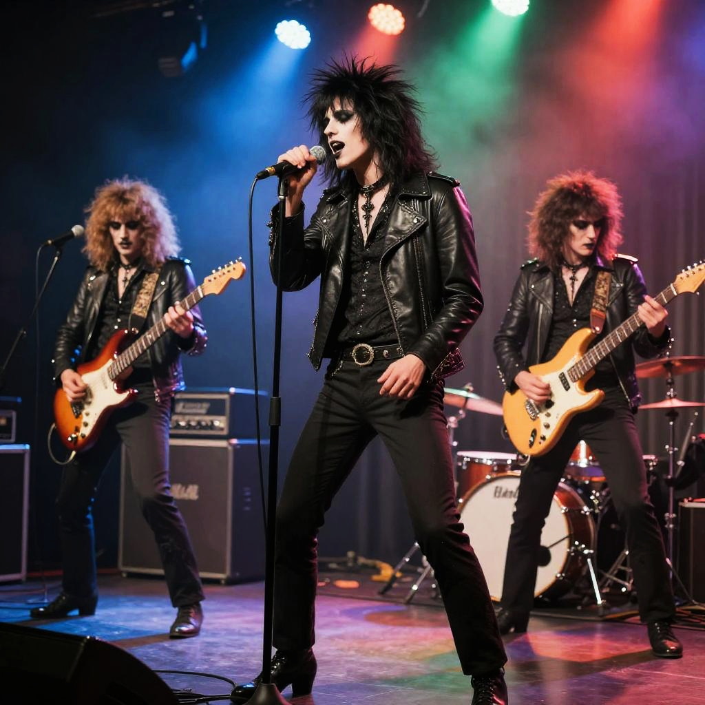 1960s goth music band performing live on stage, members in vintage gothic attire with dark eyeliner and teased hair, colored spotlights and smoky atmosphere