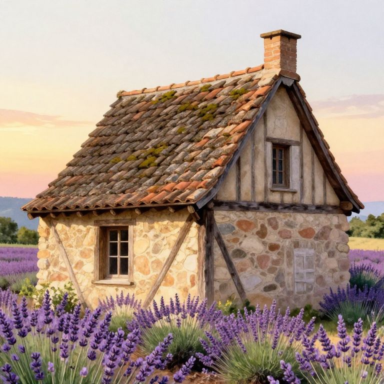 Toiture of a traditional French countryside cottage, aged clay tiles with moss, rustic wooden beams, surrounded by blooming lavender fields under a soft golden sunset, detailed texture, charming and serene atmosphere, watercolor style