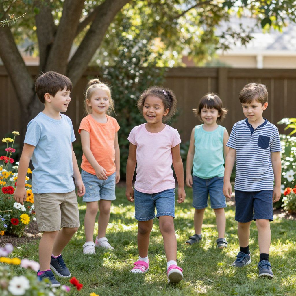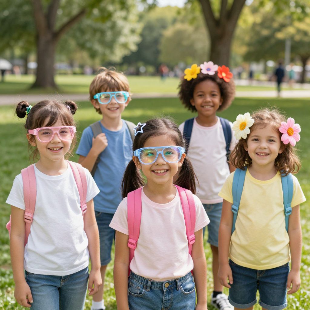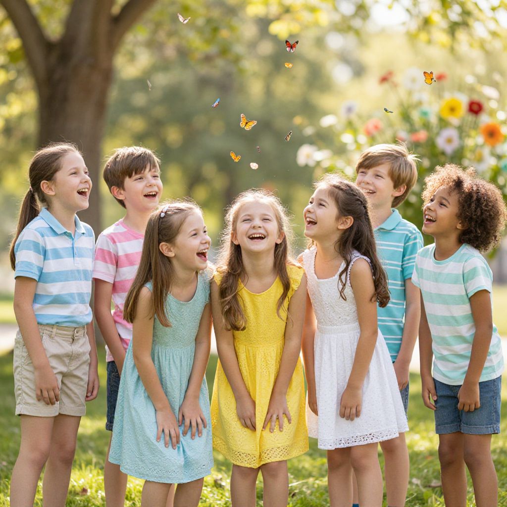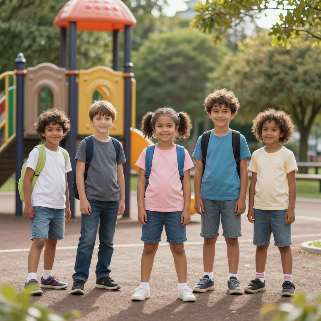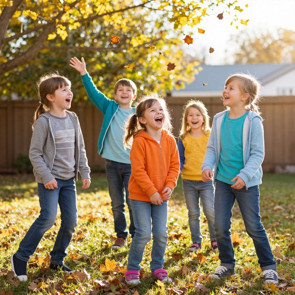 Kids photo prompts: A group of diverse children sitting on a park bench during golden hour, smiling, holding hands, with soft shadows and a backdrop of autumn leaves, emphasizing warmth and connection in a real-life setting.