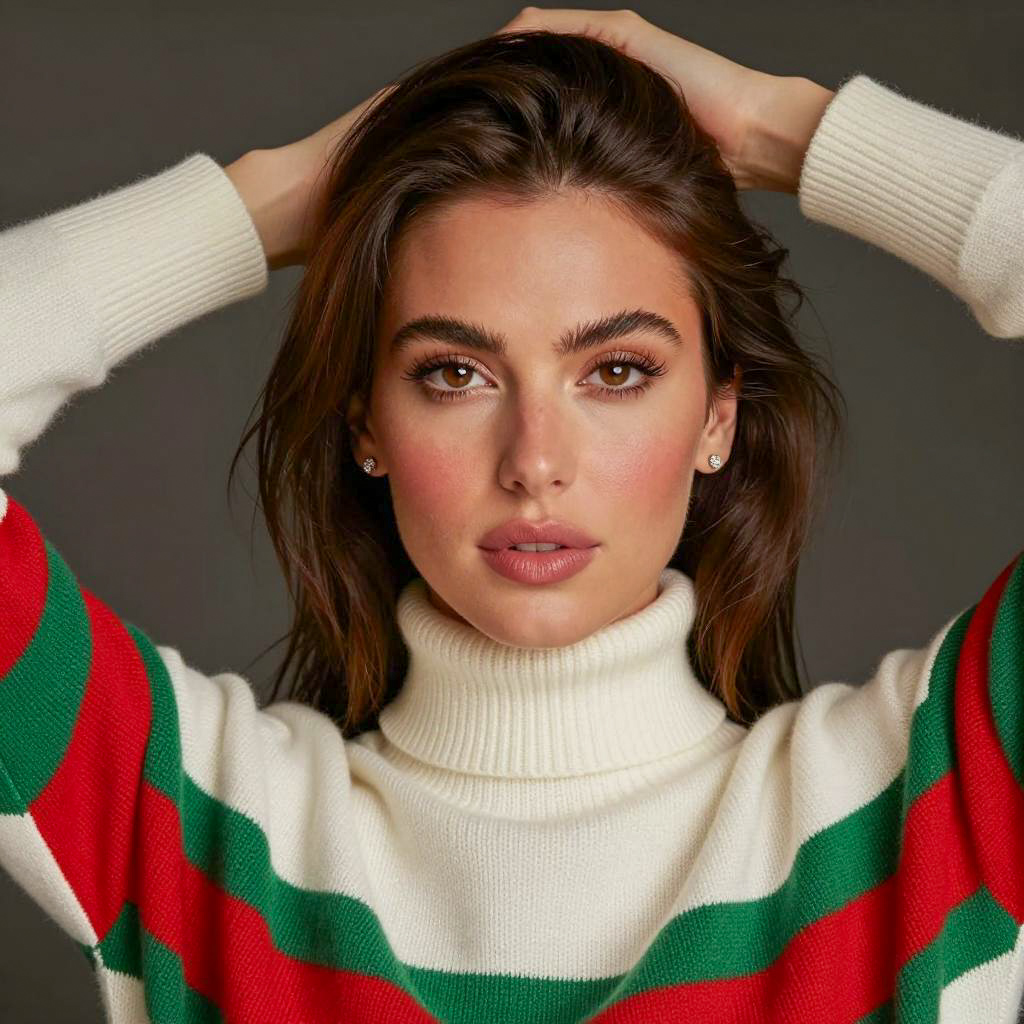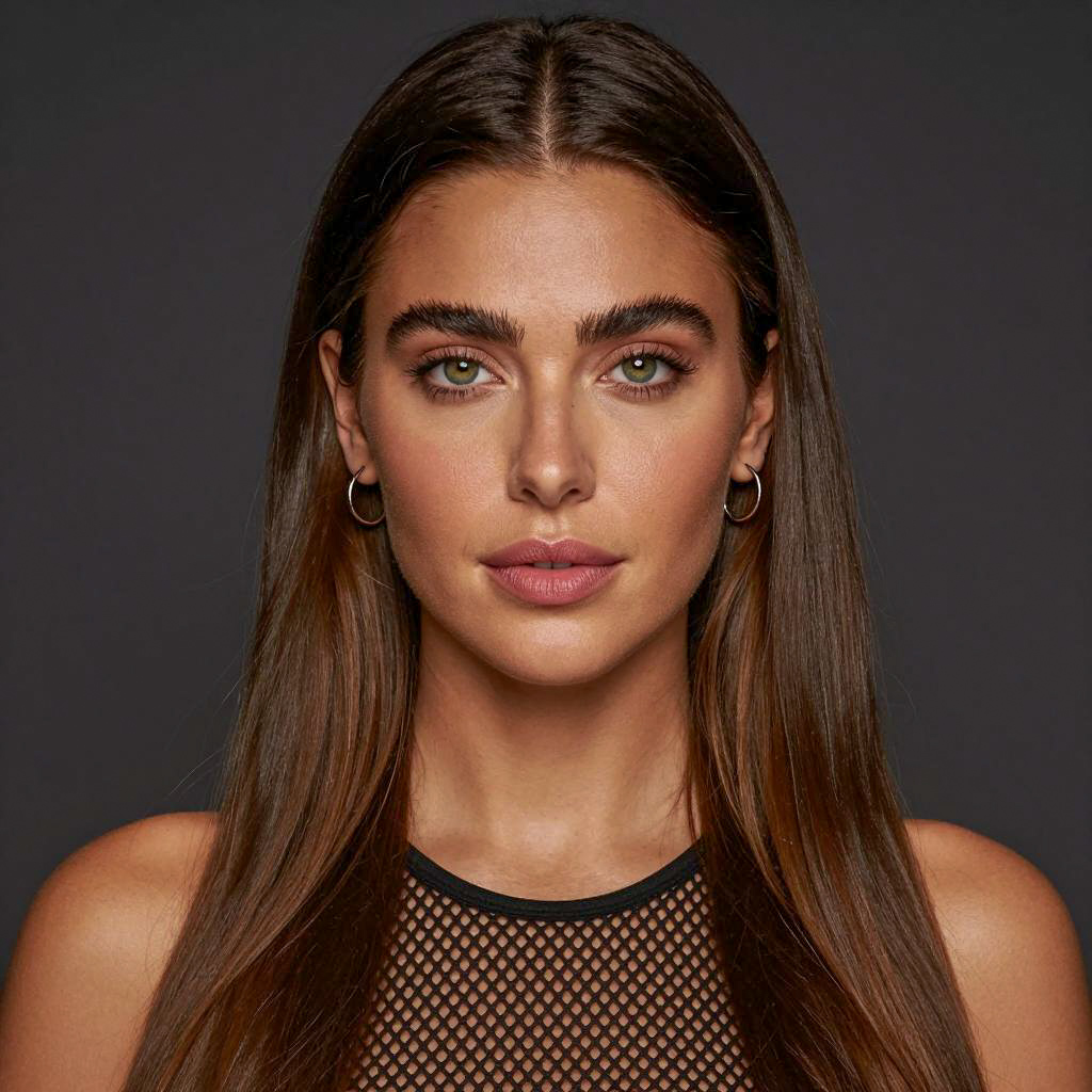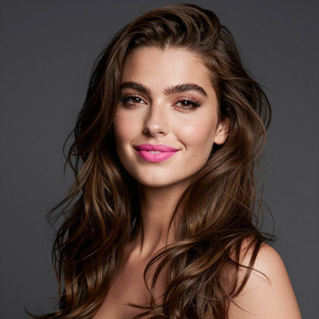 Close-up photo of a woman with light brown skin, long brown wavy hair, and green eyes. She has full glossy pink lips, defined eyebrows, and shimmering eyeshadow with long eyelashes. She wears a beige jacket and looks upward with a slightly tilted head. The background is plain and light-colored, focusing on her face and upper shoulders.