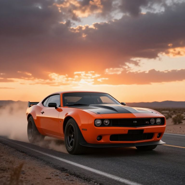 Photograph of a vibrant orange Ford Mustang with black racing stripes, speeding on a desert road at sunset, clouds glowing orange and purple in the sky.