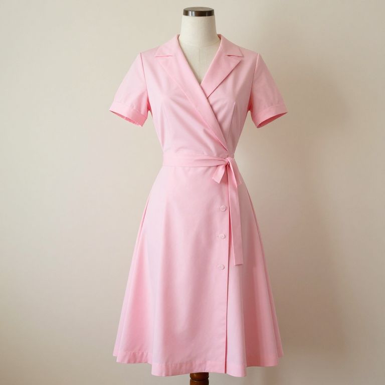 Photograph of a pink satin wrap dress on a white dress form, featuring short sleeves, V-neck, and tied waist, against a plain white background