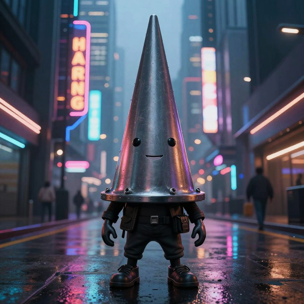 Conehead character standing on a futuristic city street, large exaggerated cone-shaped head, neon lights reflecting off metallic surfaces, cyberpunk style, detailed textures, vibrant colors, moody atmosphere, urban nightlife scene.