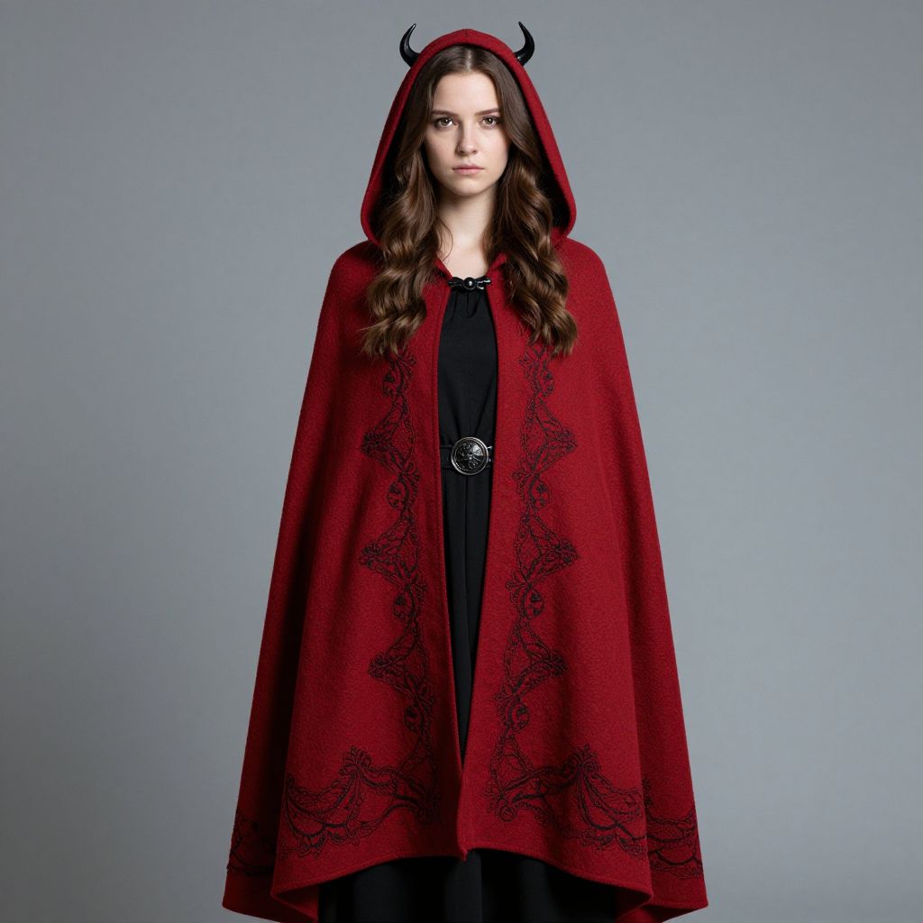 Photograph of a young woman with fair skin and long, wavy brown hair, wearing a red hooded cape adorned with intricate black floral patterns. The hood features small black devil horns. She has a serious expression and is dressed in a black top with a circular pendant necklace. The background is a solid, gradient gray, providing a neutral contrast to her vivid red cape. The overall style is modern and slightly gothic, with a focus on the dramatic, symbolic elements of the devil horns and cape.