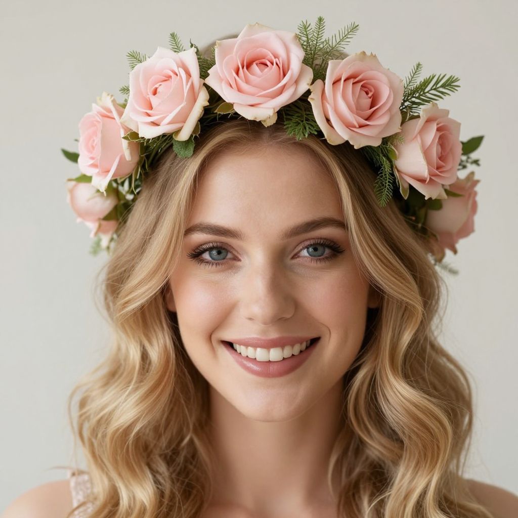 Blonde bride showcasing a romantic updo hairstyle adorned with a delicate floral crown featuring blush pink roses and white baby's breath, complemented by elegant pearl drop earrings.