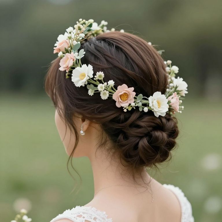 Photograph of a blonde Caucasian woman in profile, showcasing an elegant updo hairstyle with a braided bun at the nape of her neck. She wears a delicate floral crown adorned with pale pink roses and white tiny flowers. Her makeup is subtle, with defined eyebrows and pink lipstick. She has long, dangling white earrings. The background is softly blurred, with neutral tones, emphasizing her refined appearance. She wears a white lace garment, visible at the shoulders. The image has a soft, natural light, highlighting her delicate features and intricate hairstyle.