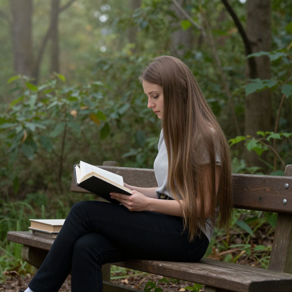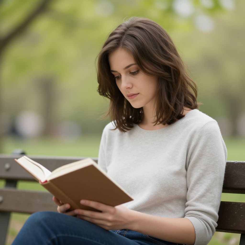 A cozy bedroom interior with golden hour lighting, showcasing gold damask wallpaper on the entire wall, the wallpaper features elegant, symmetrical floral motifs in rich gold and maroon, with a soft, vintage atmosphere, a person with kind, calm eyes and medium-length brown hair sits on the bed reading a book.