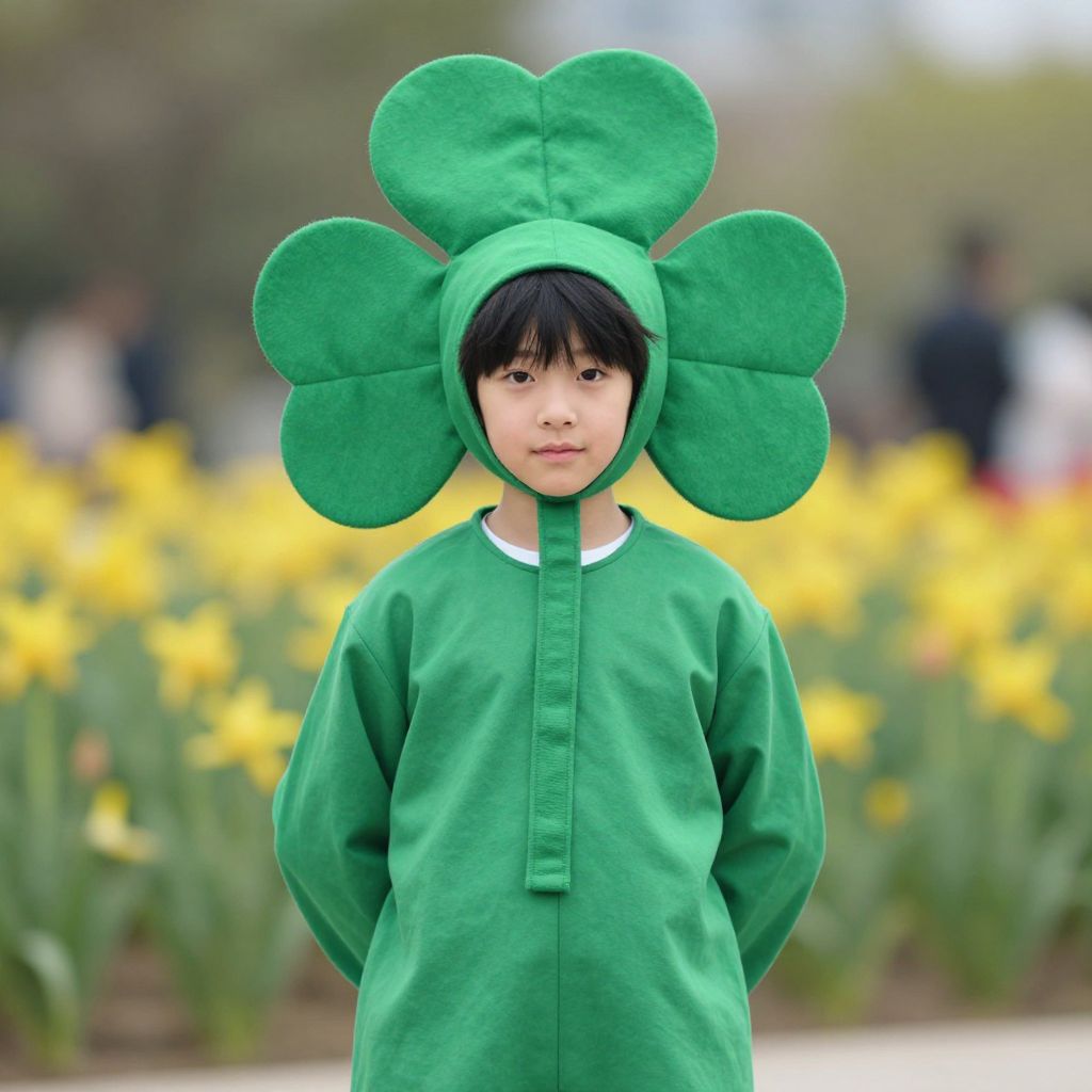 Photograph of an Asian boy with straight black hair, wearing a green, plush four-leaf clover hooded costume with large, rounded leaves on top. The costume has a buttoned front and is made of soft, velvety fabric. He stands in front of a blurred background of vibrant yellow daffodils and green foliage, with indistinct people in the distance. The boy's expression is neutral, and he has light skin. The bright green of the costume contrasts with the yellow flowers, creating a vivid, springtime scene.