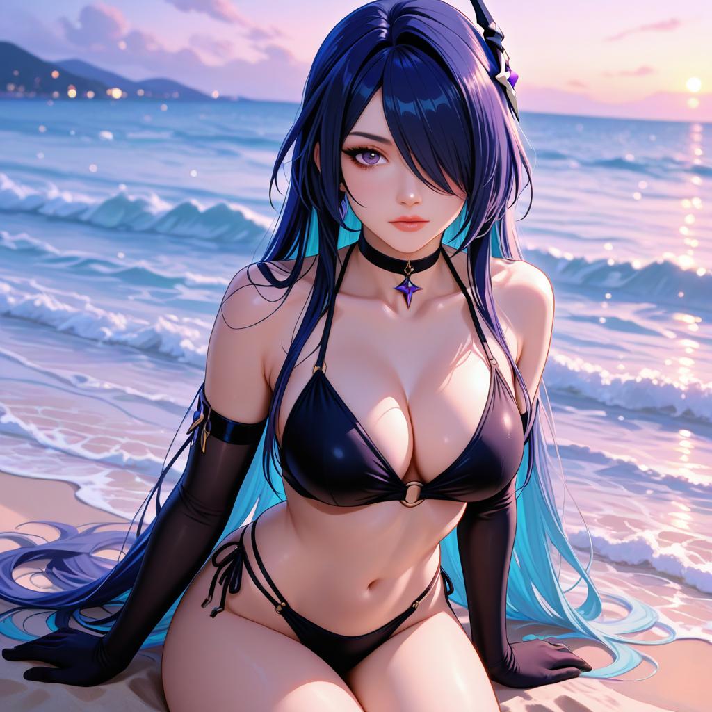 Cowboy shot, acheron honkaistarrail, 1girl, solo, sitting, looking at viewer, very long blue hair, hair over one eye, purple eyes, black bikini, cleavage, elbow gloves, beach, vibrant colors, serene beach scene, relaxed yet confident demeanor, held up with a golden comb, choker with star charm, knotted side ties, alive and carefree