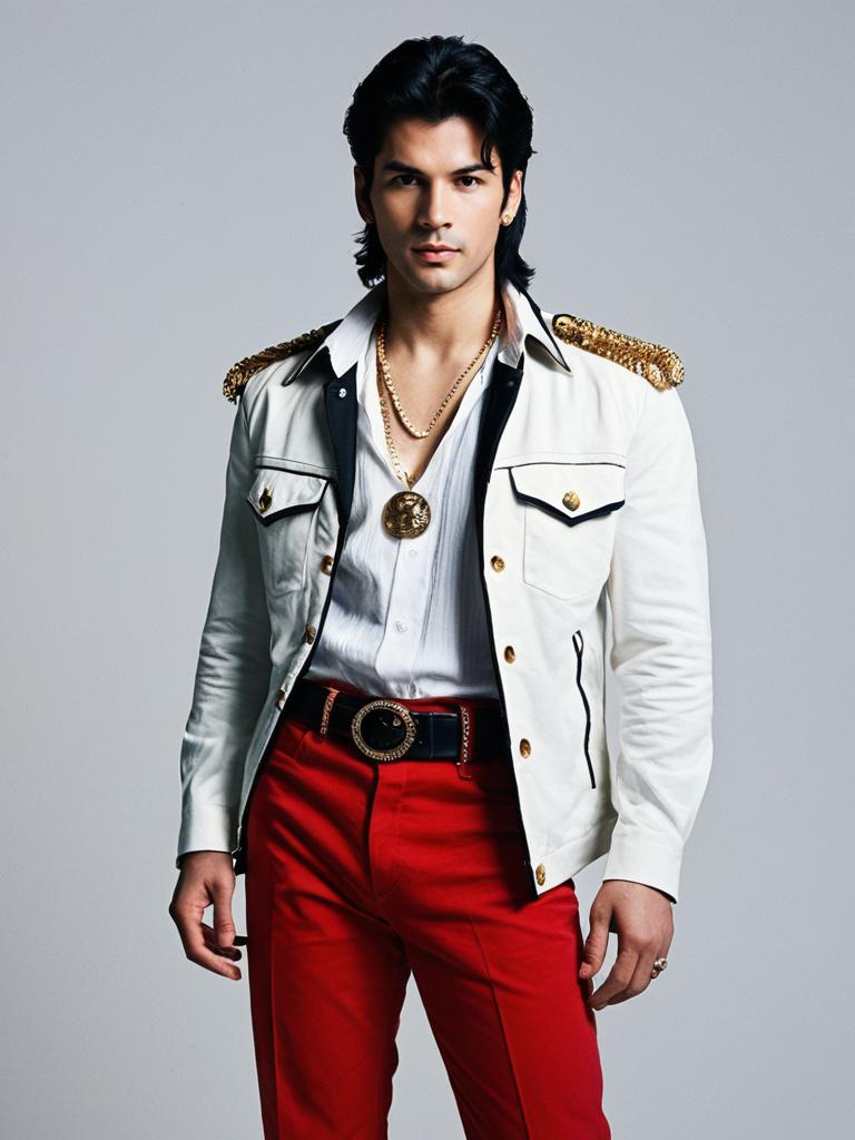 Portrait of a male model with black hair wearing a Prince-inspired pop star costume. The outfit features a white jacket with gold decorative shoulder epaulets and matching gold buttons, a white shirt partially unbuttoned, red pants, and a black belt with a large, ornate buckle. The model accessorizes with gold jewelry including a thick chain necklace with a large pendant, earrings, and rings. The background is simple and gray, making the subject the primary focus.