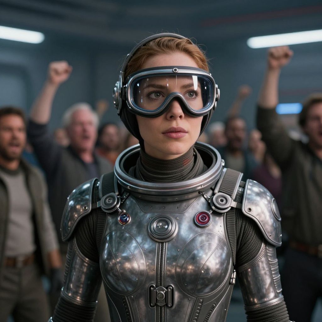 A futuristic woman in a metallic space suit and goggles, with a crowd cheering in the background, in a sci-fi movie scene.