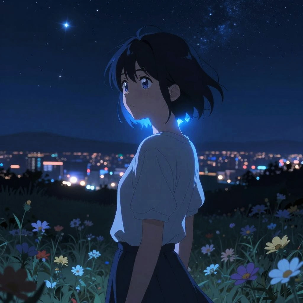Anime girl, night, blue light behind her, ((Galaxy, Lens flare)), short hair, flower field, night sky, cinematic shot. Wallpaper. (Blue color schema), detailed background, a city in the distance