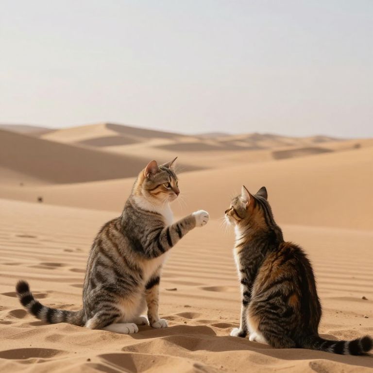 Photograph of two cats in a desert landscape with golden sand dunes under a bright, clear sky. The cat on the left, with a grey and white tabby coat, is sitting and extending a paw towards the other cat, which has a brown and black tabby coat with white patches. Both cats are looking at each other, creating a sense of interaction. The sand is smooth with subtle ripples, and the sunlight casts soft shadows. The background shows more undulating sand dunes, creating a vast, open, and arid environment.