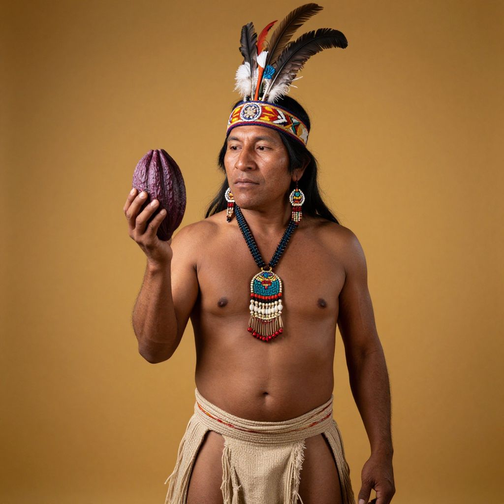 The image depicts a man from the pre-Inca culture, likely from the Mayo Chinchipe region, holding a cacao pod in his right hand. He is wearing a traditional headdress adorned with colorful feathers and a bandana, along with a necklace featuring a pendant and beads. His attire includes a loincloth and a sash, adding to his cultural attire. The man's muscular build and the detailed textures of his skin, hair, and clothing suggest a realistic portrayal. The background is a warm, golden hue, creating a contrast that highlights the man's figure. The overall composition is balanced, with the man centrally positioned and the cacao pod held prominently in front of him, emphasizing the cultural significance of the cacao in his society.