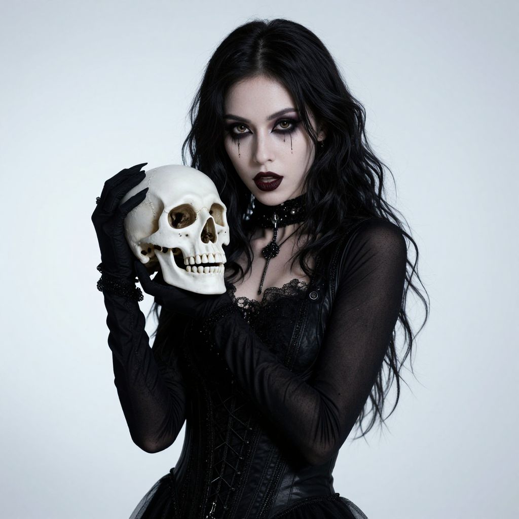 Photograph of a pale, dark-haired woman with long, wavy locks, wearing a sheer black dress and black gloves. She holds a white skull in her right hand, positioned near her face. Her makeup is heavy, with dark, smoky eyes and deep burgundy lipstick. She wears a black choker with a small pendant. The background is a stark, solid white, highlighting her gothic, macabre appearance. The image has a high-contrast, dramatic style, emphasizing her eerie, mysterious look.