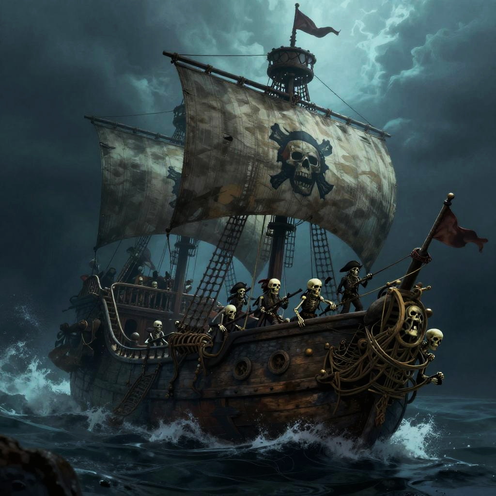 Gloomy underwater pirate ship with tattered sails, ghostly pirate skeleton crew visible on deck, dark and moody ocean environment, dramatic shadows, high detail illustration