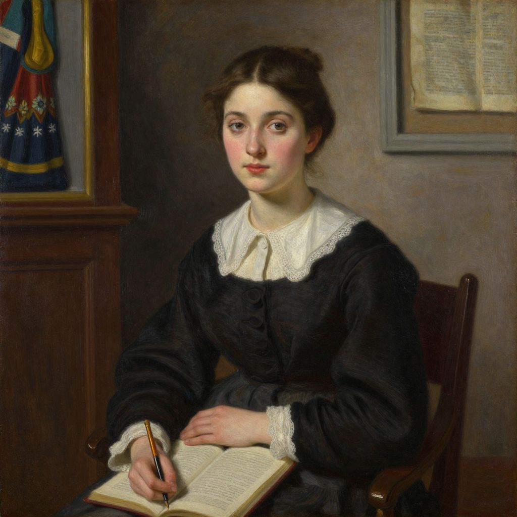 This is a digital painting in a realist style depicting a young woman with fair skin and dark brown hair in an updo, wearing a white blouse with lace trim and a dark blue shawl. She holds an open book in her right hand, looking slightly to the left with a serious expression. The background shows a dimly lit room with wooden furnishings, including a bookshelf and two other seated men in dark clothing, one with his back to the viewer. The walls are adorned with light-colored panels and a decorative window above the seated men. The overall atmosphere is scholarly and somber.