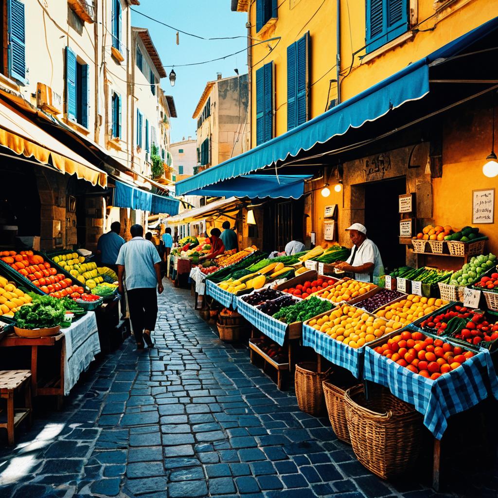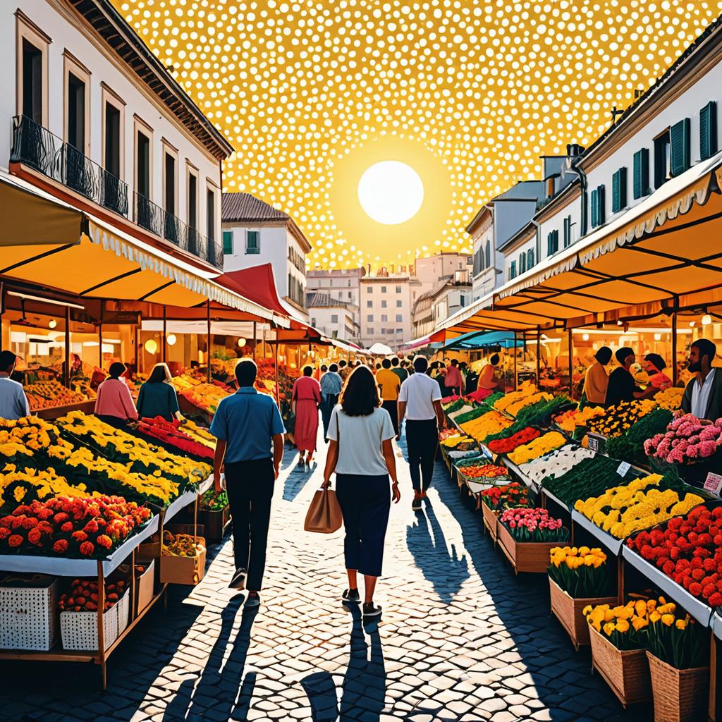 Technique Create a digital illustration of vendors selling fruits and flowers. Set in a vibrant Mediterranean market, with vibrant lighting capturing the essence of summertime. Inspired by Henri Rousseau, the composition emphasizes lush greenery intertwined with vibrant displays of produce.