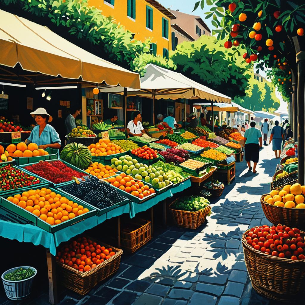 Digital illustration of a vibrant Mediterranean outdoor market with vendors selling a variety of colorful fruits displayed in baskets and crates. The market is set on a cobblestone street lined with green leafy trees and yellow buildings with green shutters, capturing the lively atmosphere of summertime. People in casual summer clothing and straw hats walk among the stalls filled with oranges, pineapples, tomatoes, blackberries, and more, inspired by Henri Rousseau's style emphasizing lush greenery and vivid lighting.
