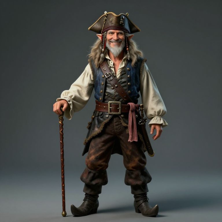 Depth full body elf pirate, peg leg, smiling, aged face, holing a cane, detailed, photorealism, Photorealism