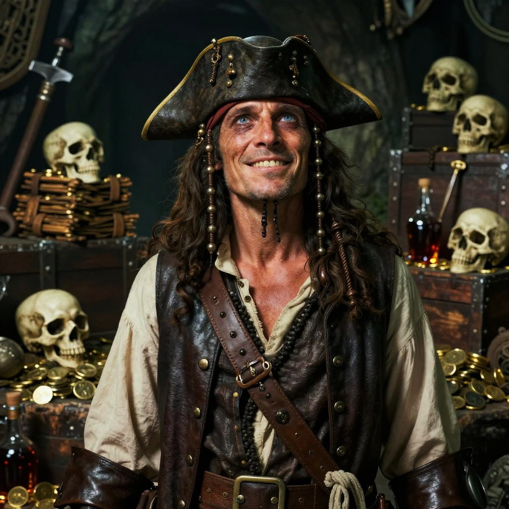 Photograph of a smiling, elderly, fantasy-style pirate with long white beard, tricorn hat, fur collar, leather vest, and brown pants,