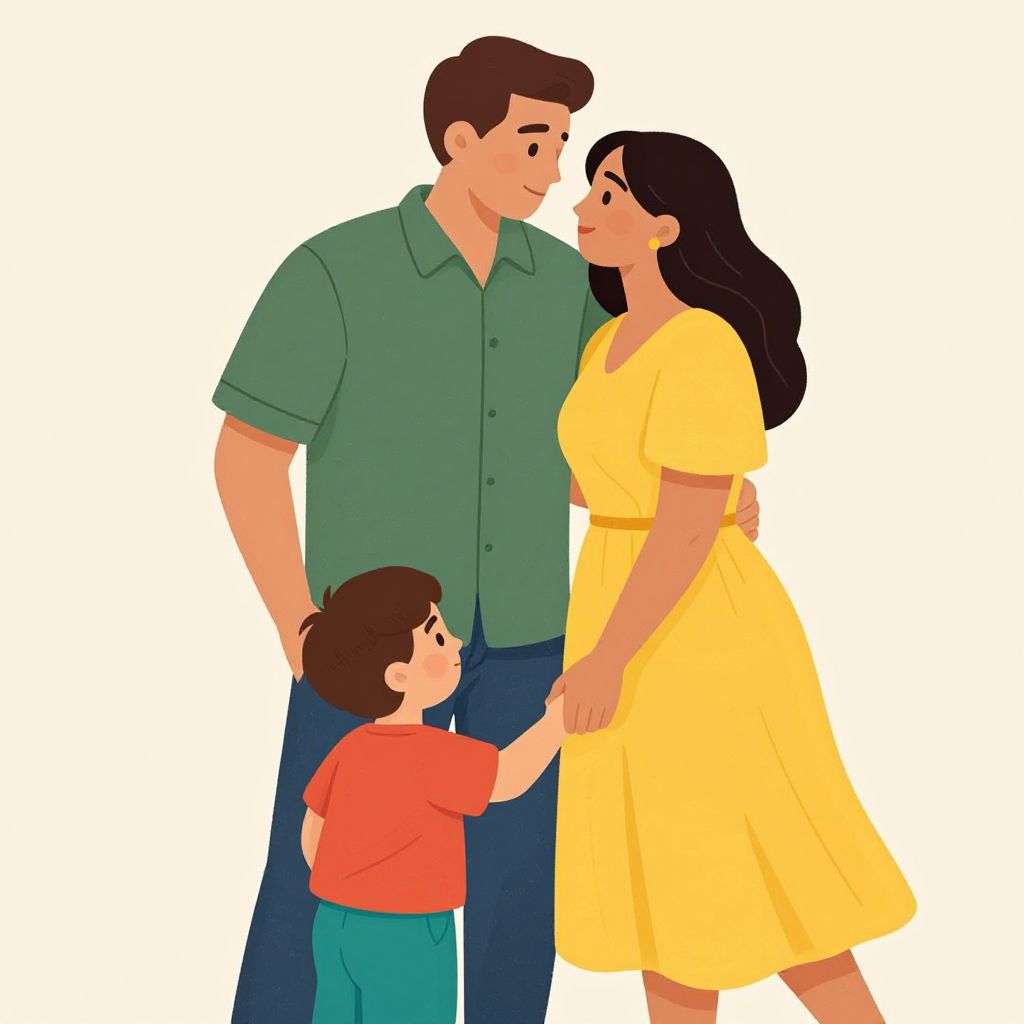 Family members embrace warmly in a vibrant illustration, featuring a man in a green shirt and jeans standing behind a woman in a yellow dress, while a child in a red top and teal pants reaches out to hold her hand, all set against a soft beige background.