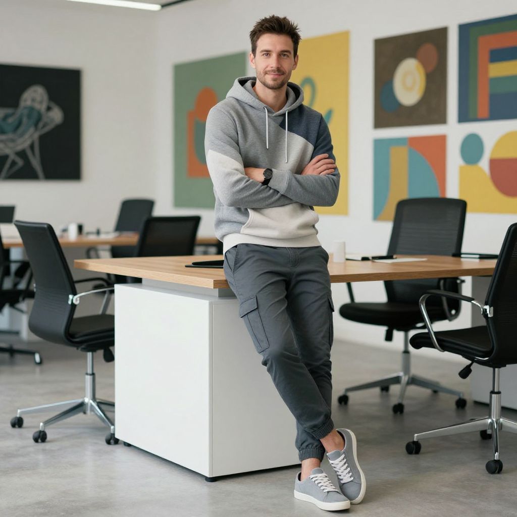 Photograph of a young Caucasian man with short, dark brown hair and a trimmed beard, leaning casually against a white office desk. He wears a grey and white hoodie, dark grey cargo pants, and white sneakers with black accents. His arms are crossed, and he smiles slightly. The modern office has black office chairs with metal bases, a wooden desk, and colorful abstract art on white walls in the background. The floor is grey concrete, and the lighting is bright and even, highlighting the clean, contemporary workspace.