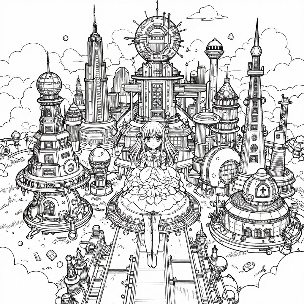 Bishoujo Fantasy Fairy futuristic cities: An Adult Coloring Book Full of Whimsical cities Fantasy Fairy cities in the future lineart, drawing, cartoon, black and white,