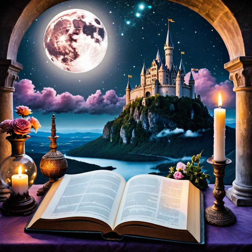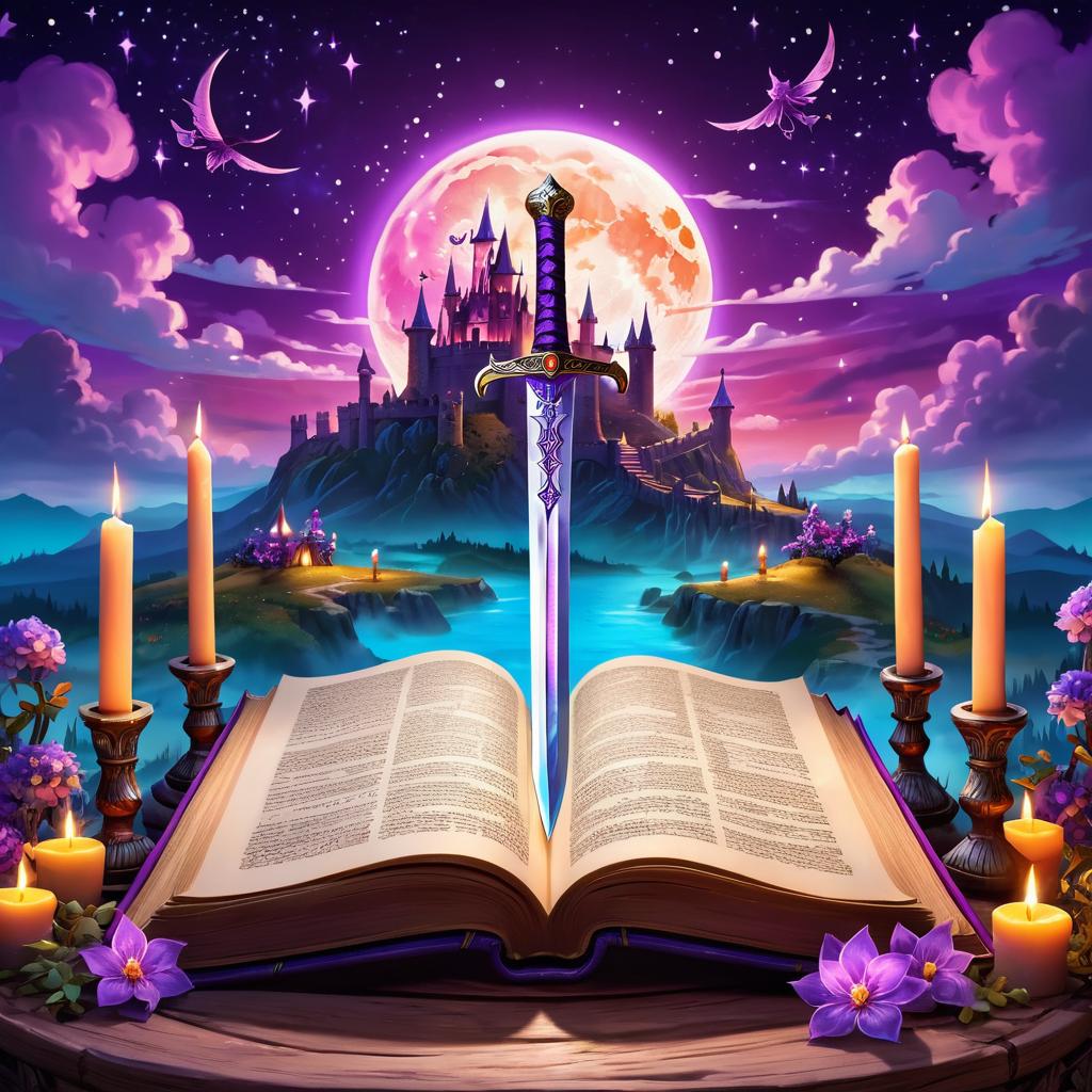A glowing magical sword standing upright in the middle of an ancient open book on a wooden table, surrounded by burning candles and a glowing crystal ball. Night scene with a large bright moon illuminating purple clouds and distant castle silhouette. Fantasy mystical atmosphere with vibrant colors, deep shadows, and warm candlelight highlighting intricate details of the sword and surroundings. Enchanted garden setting with flowers and mystical elements.