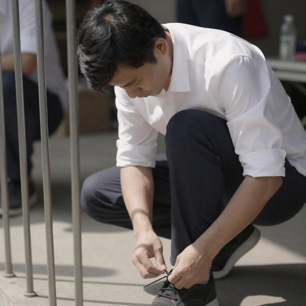 A man with dark hair and medium build crouching outdoors, focused on tying the lace of his black shoe. He is dressed in a white long-sleeve shirt with rolled up sleeves and dark pants. Vertical metal rods are visible in the foreground. The scene is lit by natural sunlight casting shadows, with blurred people and objects in the background.