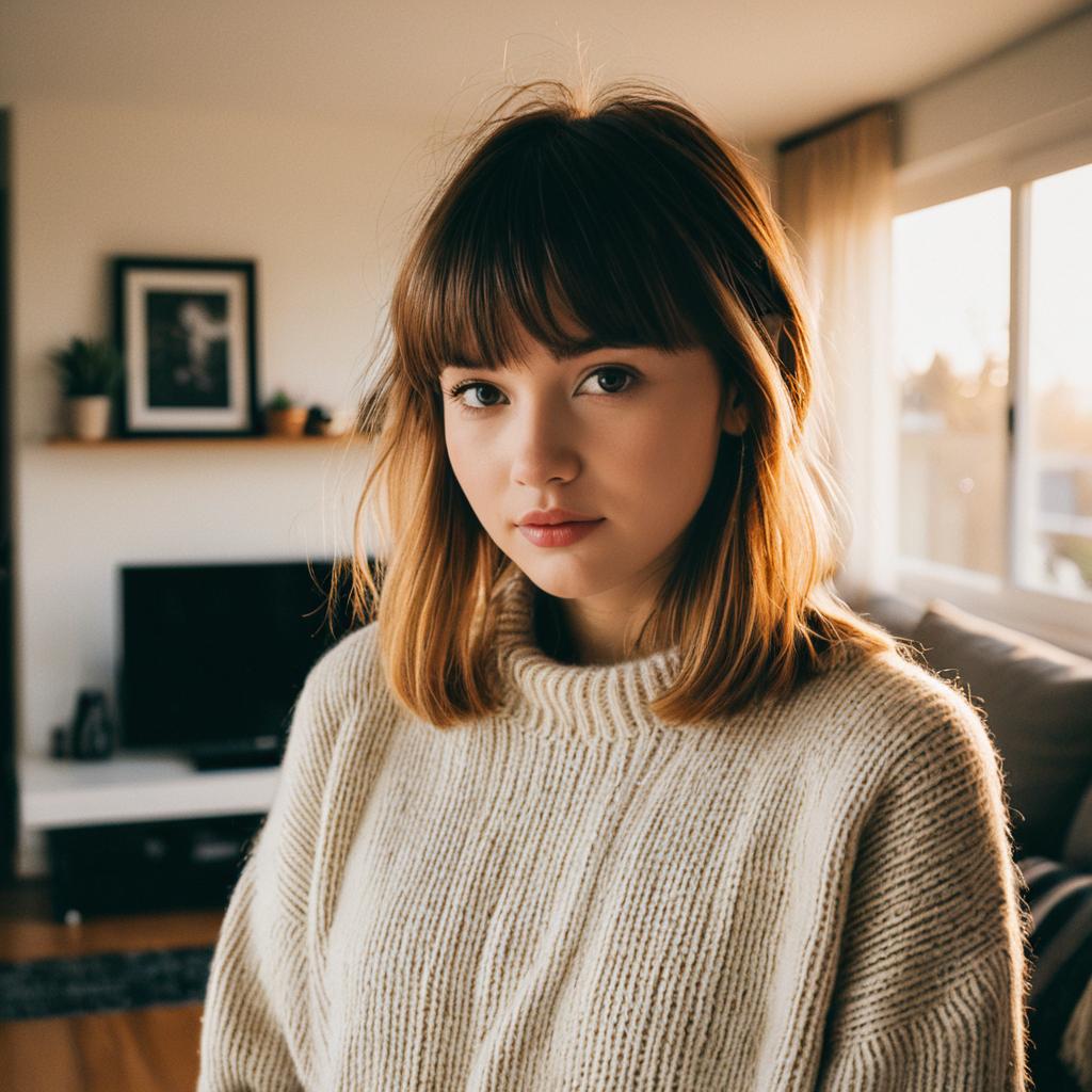 Side Swept Bangs hairstyle on young girl, wearing cozy sweater, in modern home, captured in fashion editorial style with natural golden hour.