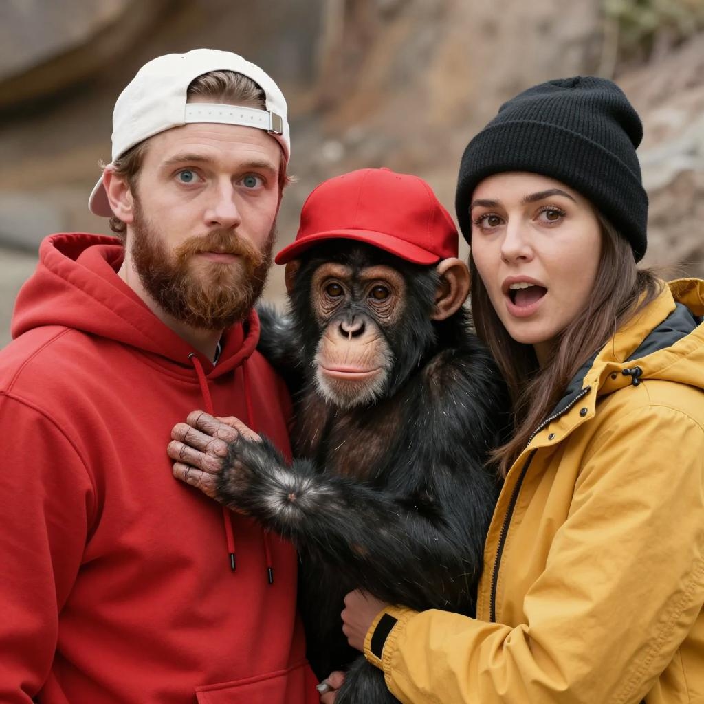 Three people in an outdoor setting. A bearded man with a white backward cap, red hoodie, and wide-eyed expression on the left. A small chimpanzee wearing a red cap in the center, gripping the man's shoulder. A woman with long brown hair, black beanie, and yellow jacket on the right, with an open-mouthed expression. Dry, rocky background. The chimpanzee's hands rest on the man's chest. The man's right arm around the chimpanzee's shoulders. The woman's left arm slightly behind the chimpanzee's back.