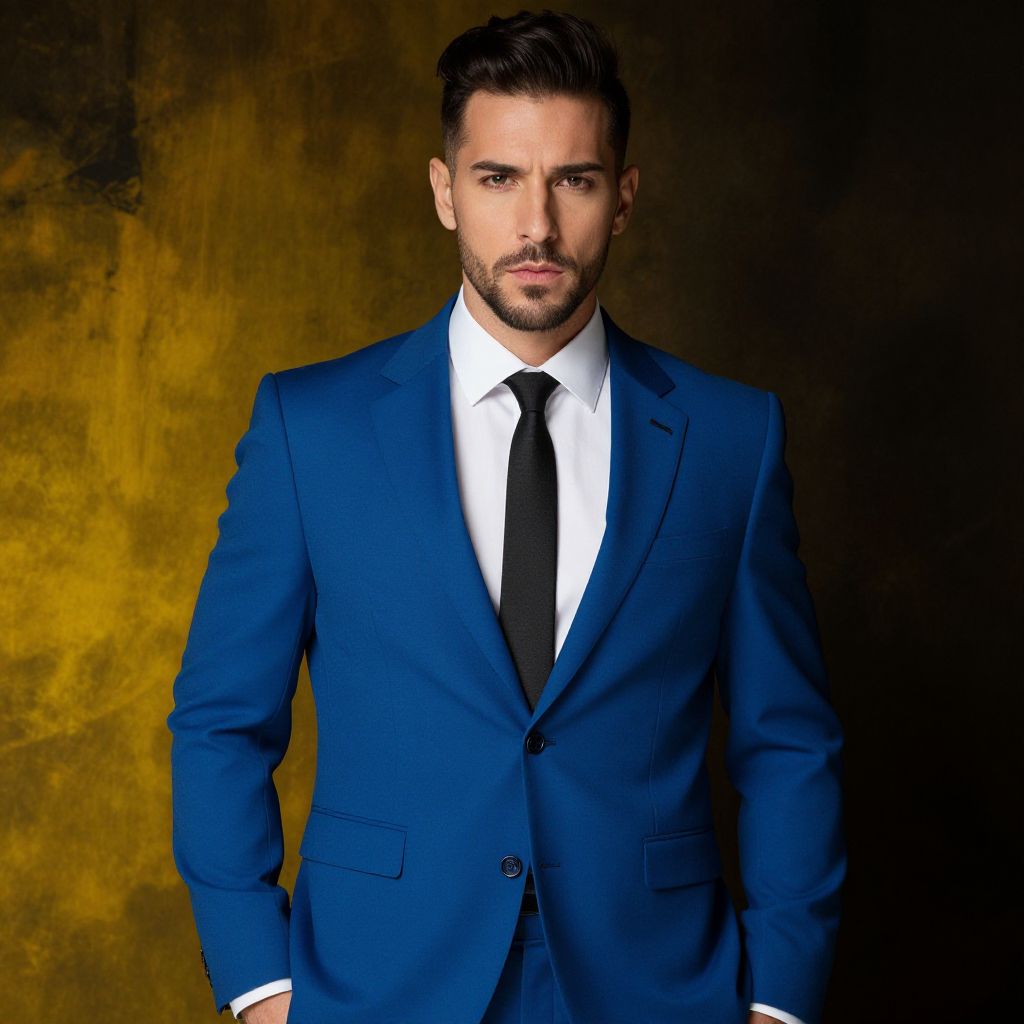 A striking portrait of a man in a stylish blue suit, exuding confidence against a dramatic backdrop featuring abstract yellow and dark elements. The composition blends fashion with a hint of mystery, creating an intriguing aesthetic that captivates the viewer.
