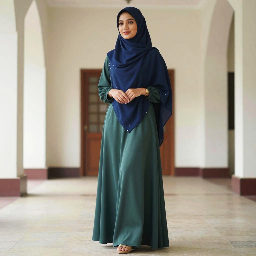 Muslim Princess Dress, a woman in a blue and green dress standing in a building