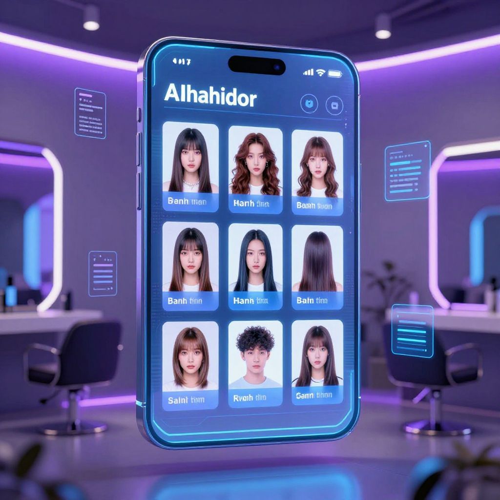 AI haircut generator interface displayed on a sleek futuristic holographic screen, surrounded by virtual hairstyle options, neon blue and purple lighting, digital elements floating around, ultra modern salon atmosphere, high-tech design aesthetic